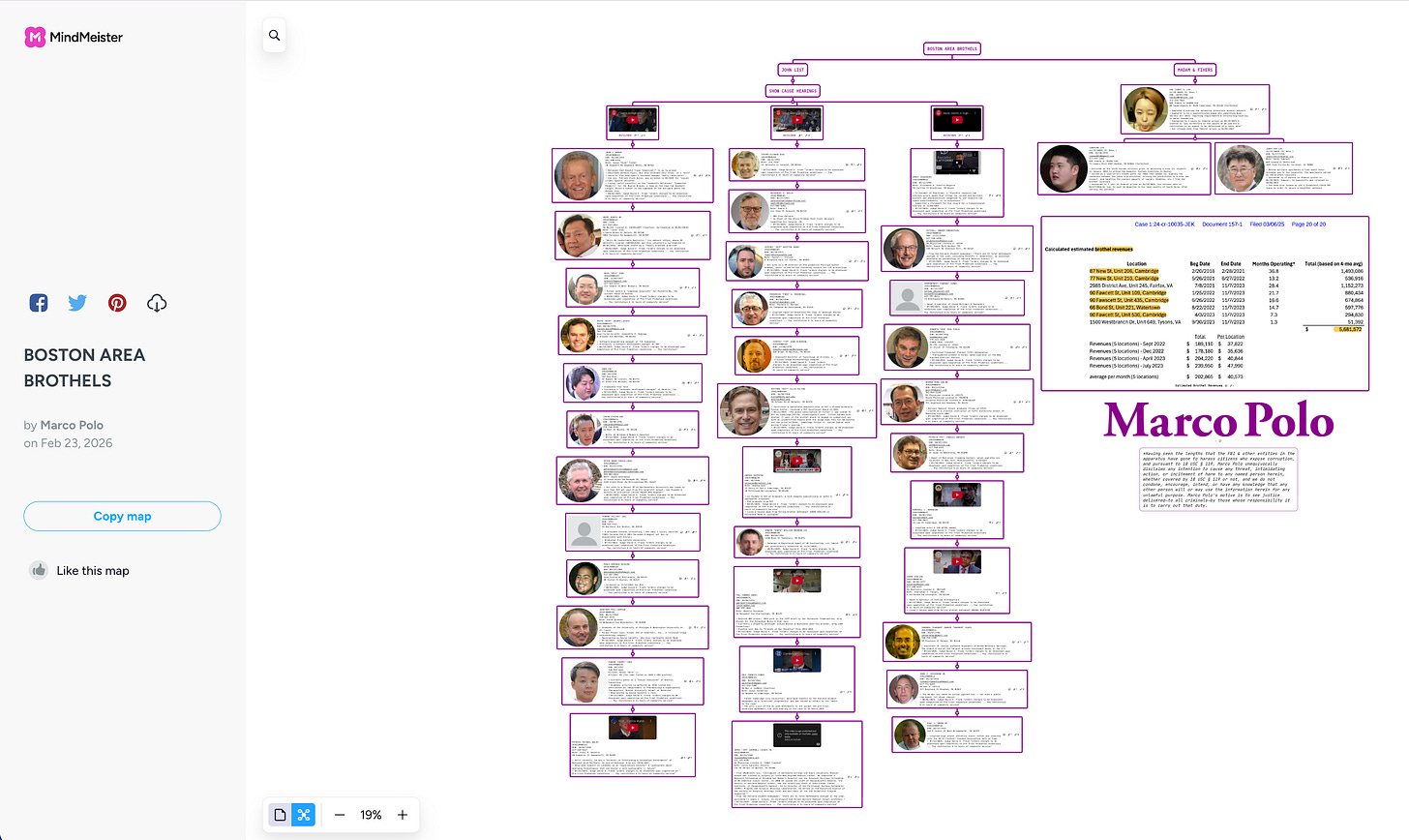 An Asian madam set up several apartments in Cambridge & Watertown, extracting millions of dollars over several years from johns. Marco Polo is the only organization on Earth to map out the johns who have been revealed so far. The Boston Herald described it this way: "Of the thousands of men who frequented the Boston-area services, the cases of more than 30 of them were heard in court in Cambridge in March. Each was found to have probable cause for a criminal complaint to be issued."